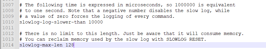 slowlog-log-slower-than 10000 表示慢查询阈值为10毫秒,单位为微妙,如果设置为小于0的数则表示不记录慢查询。slowlog-max-len 128 表示保存的慢查询队列的长度。如下图所示为Redis配置文件中对慢查询的默认设置,