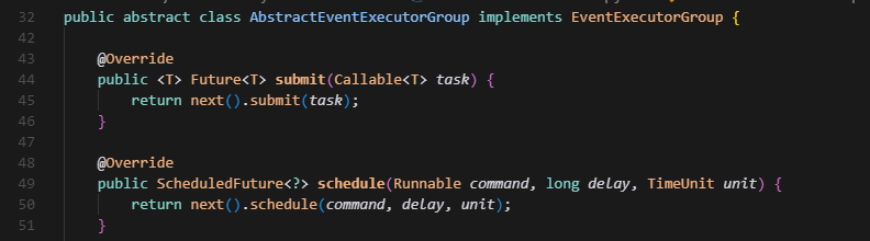 MultithreadEventExecutorGroup继承自AbstractEventExecutorGroup->EventExecutorGroup->ScheduledExecutorService(Java中的定时任务接口),然后在AbstractEventExecutorGroup抽象类中实现了调度的各个方法(下图截取了一部分)。
