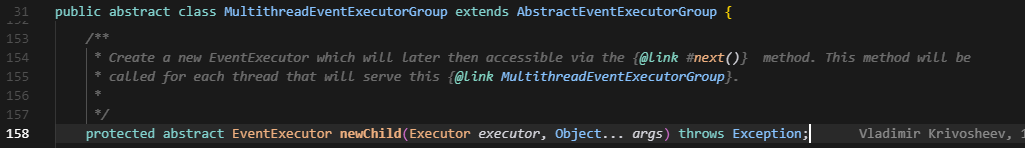 如下图所示,通过MultithreadEventExecutorGroup中定义了抽象方法newChild,EvnetLoopGroup的实现类中会直接new出对应的EventLoop实现来完成一一对应。