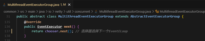 executors[idx.getAndIncrement() & executors.length - 1],可以参考HashMap计算下标逻辑。executors[Math.abs(idx.getAndIncrement() % executors.length)],这种方式的效率没有优化版本好,并且注意:如果idx的值超过整数的最大值会导致数据溢出,此时前后获得的一部分数据是不公平的轮询进行了翻转。如下图EventLoopGroup中会通过next方法,通过选择器选择下一个EventLoop