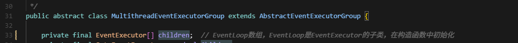 如下图所示,MultithreadEventExecutorGroup是其它EventLoopGroup实现类的父类,用一个数组维护一组EventLoop。