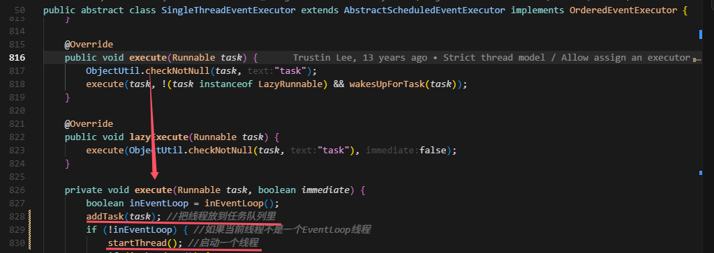 SingleThreadEventLoop通过父类SingleThreadEventExecutor实现任务的调度逻辑,然后Bootstrap中会调用EventLoop的execute方法把线程传入来执行异步执行。