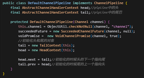 DefaultChannelPipeline是ChannelPipeline的唯一实现类,摘取DefaultChannelPipeline中一部分源码如下图:
