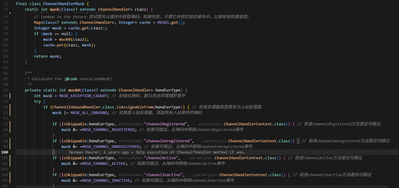 ChannelHandler的executionMask的值是先把所有的掩码都进行或运算一遍,没有此事件再摘除此掩码的值,展示部分逻辑如下: