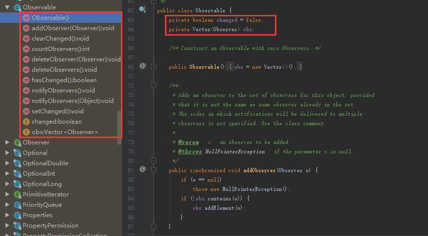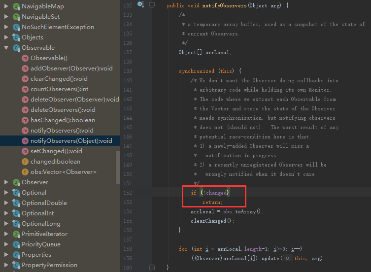有一点需注意,如下图所示,在通知观察者的方法中,changed变量如果为false则会返回,所以在调用通知方法前,先需要调用setChanged()方法。