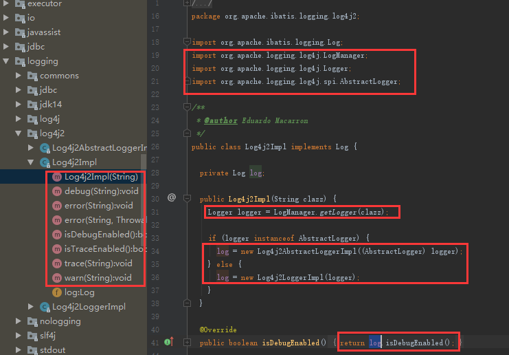 怎么让我本身的日志可以适配其他第三方日志呢,以log4j2为例,看如下Log4j2Impl代码可知,在构造函数中引用了log4j的类,生成了Logger对象,最后通过Log4j2LoggerImpl类和Log4j2AbstractLoggerImpl类转换成Mybatis自身的Log对象。
