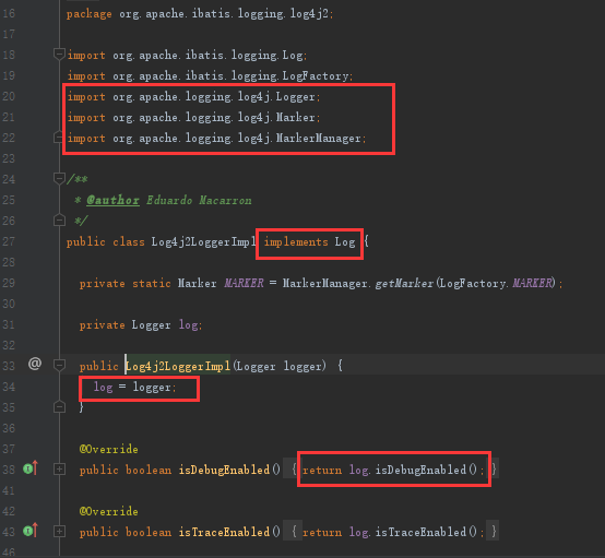 而具体的Log4j2LoggerImpl类中也很简单,如下就是把log4j2的日志对象通过构造函数传入,实现自己的Log接口,以log4j2的日志对象重写其方法。