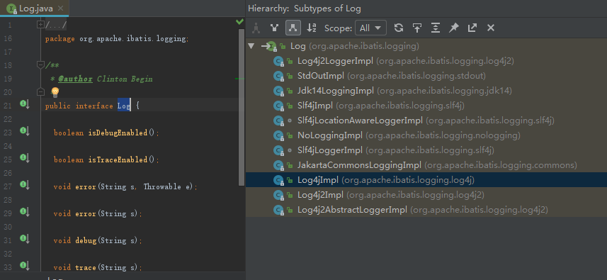 如下图所示,先找到mybatis的Log接口,看继承树发现mybatis对其他第三方日志框架都有其Log的实现类。