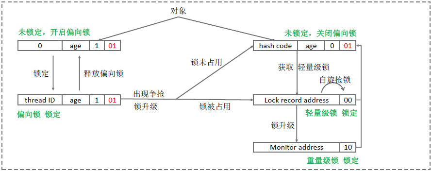 当多个线程要抢这个对象的锁,会用cas操作把tag中的01改成00,让状态变成轻量级锁。