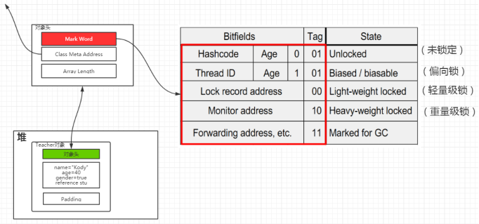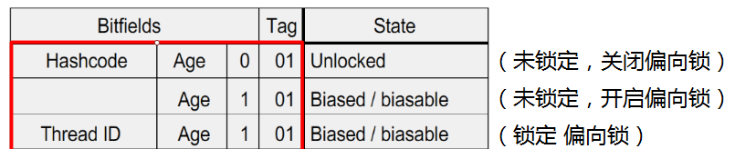 先解释一下,Mark Word是一块内存区域,里面存的值是上面表格红框部分的某一行。