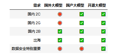 合规和安全是首要考量因素,如下列出哪些场景适合哪种大模型: