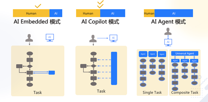AI Embedded:简单的说,就是我们生活、工作或者某个产品的某一部分接入AI大模型,让其更智能,更高效。