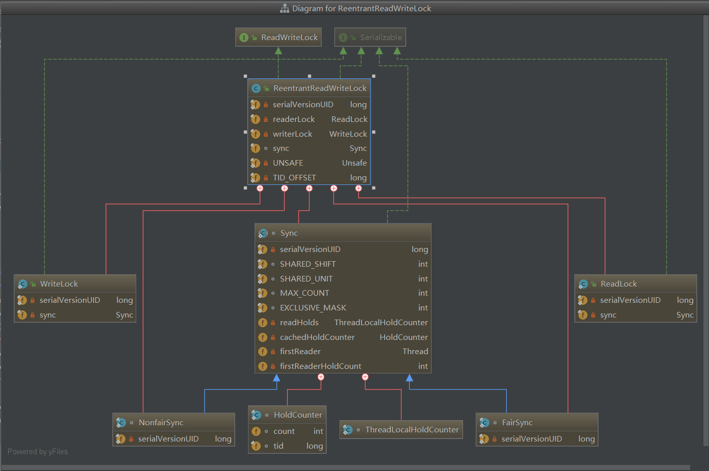 由类图可知,读写锁内部维护了一个ReadLock和一个WriteLock,他们依赖Sync实现具体功能,而Sync继承自AQS,并且提供了公平和非公平的实现。