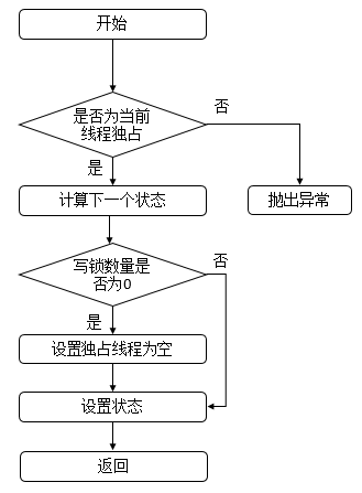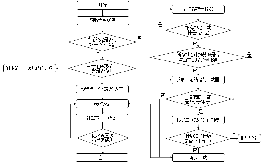 说明:此方法表示读锁线程释放锁。首先判断当前线程是否为第一个读线程firstReader,若是,则判断第一个读线程占有的资源数firstReaderHoldCount是否为1,若是,则设置第一个读线程firstReader为空,否则,将第一个读线程占有的资源数firstReaderHoldCount减1;若当前线程不是第一个读线程,那么首先会获取缓存计数器(上一个读锁线程对应的计数器 ),若计数器为空或者tid不等于当前线程的tid值,则获取当前线程的计数器,如果计数器的计数count小于等于1,则移除当前线程对应的计数器,如果计数器的计数count小于等于0,则抛出异常,之后再减少计数即可。无论何种情况,都会进入无限循环,该循环可以确保成功设置状态state。其流程图如下。