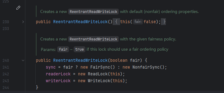 如下图所示,可以看出默认读锁和写锁都是非公平锁,也可以通过构造函数传入fair字段来指定公平和非公平锁。