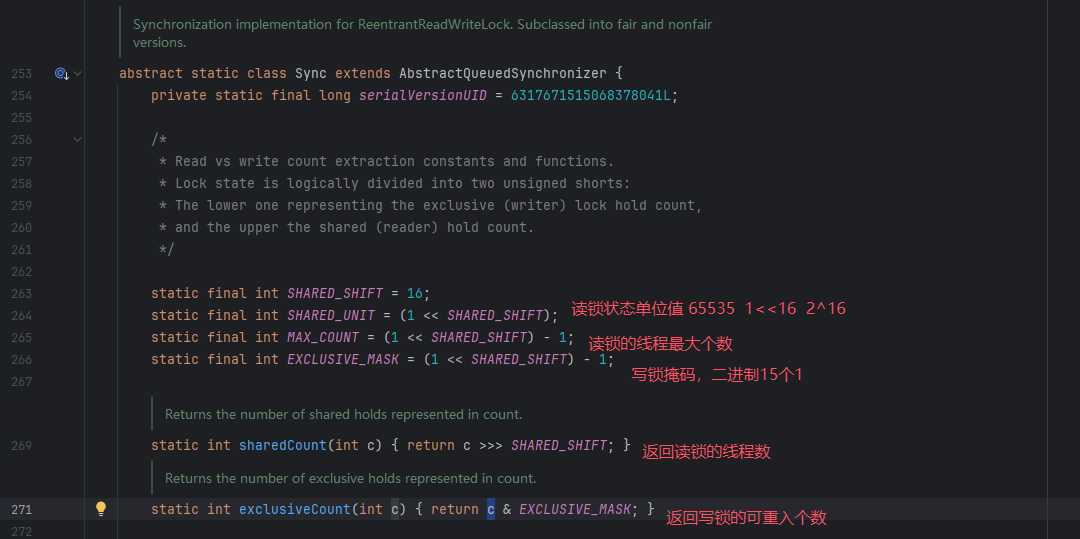 继续查看ReentrantReadWriteLock中的Sync类,如下图所示:读写锁对于同步状态的实现是在一个整形变量上通过“按位切割使用”:将变量切割成两部分,高16位表示读状态,也就是获取到读锁的次数,低16位表示获取到写线程的可重入次数。