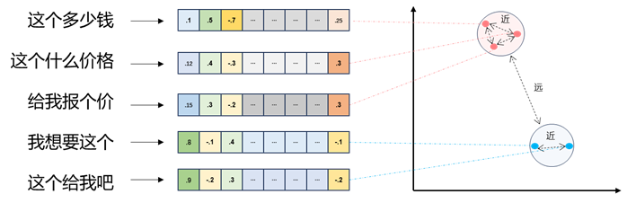 - 向量之间可以计算距离,距离远近对应语义相似度大小