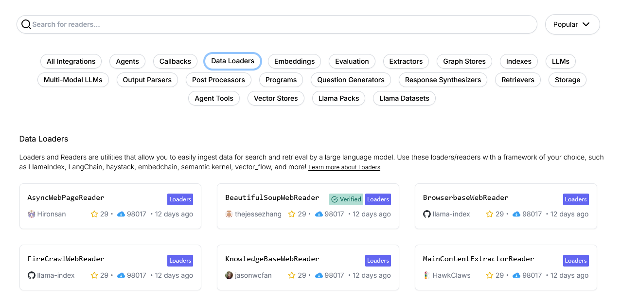 3、更多的第三方发布的加载器也可以从LlamaHub(https://llamahub.ai/)上搜索得到。