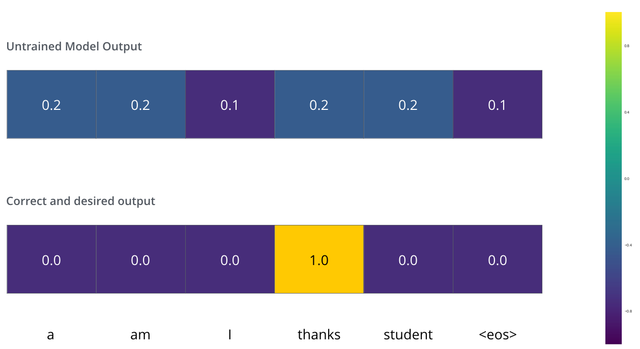 这意味着,我们希望输出是一个概率分布,以表明“thanks”这个单词,但由于这个模型尚未经过训练,这种情况不太可能马上发生。
