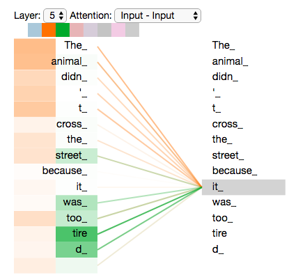 当我们编码单词“it”时,一个注意力头主要关注“the animal”(这个动物),而另一个则关注“tired”(疲惫的)——从某种意义上说,模型对单词“it”的表征融合了“animal”和“tired”两者的部分表征。