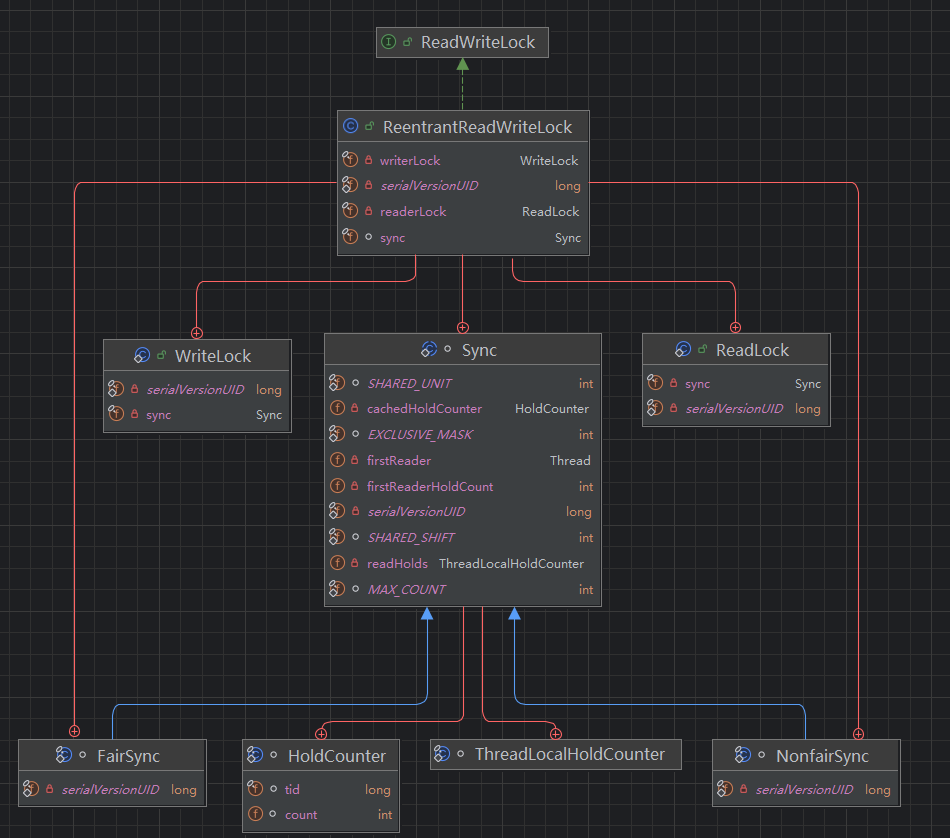 从下图可以看出,ReentrantReadWriterLock内部维护了一个读锁和写锁,并提供了公平锁和非公平锁的实现。